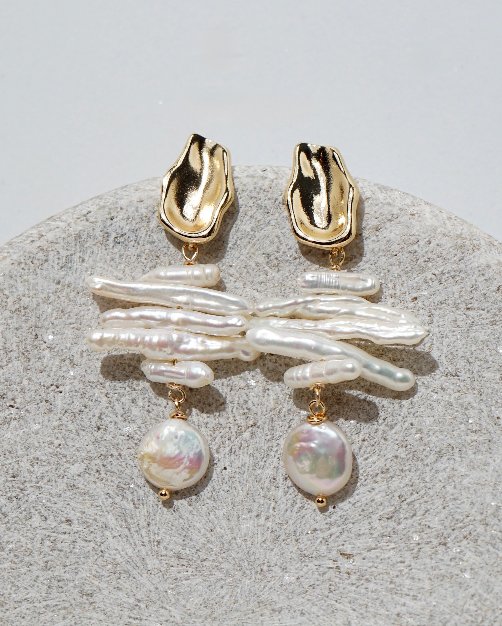 Make a statement with these stunning Baroque Pearl Earrings, a perfect blend of modern artistry and natural beauty. Each earring features a sculptural gold-plated stud reminiscent of an oyster shell, delicately layered with unique freshwater stick pearls and finished with a lustrous round pearl drop.