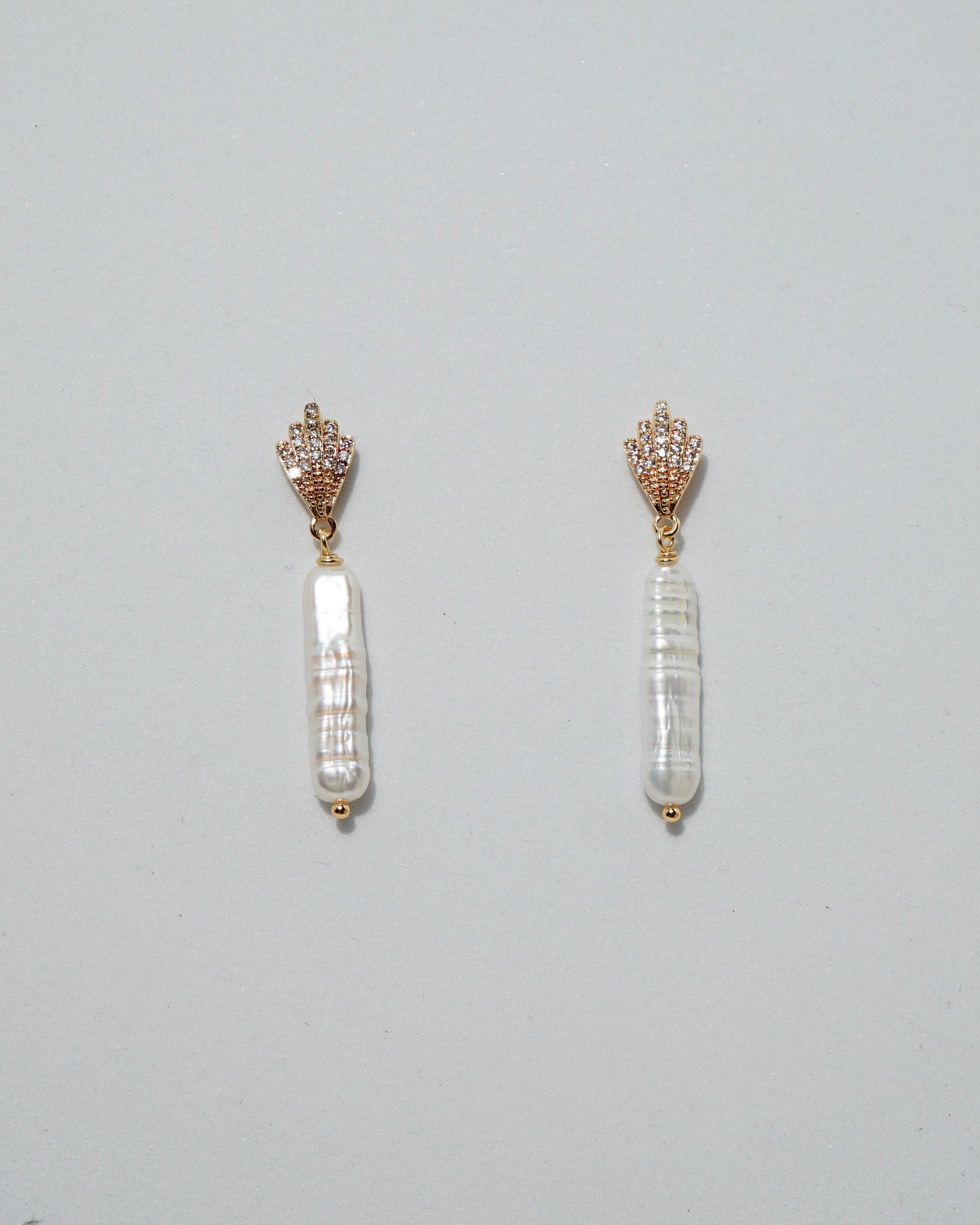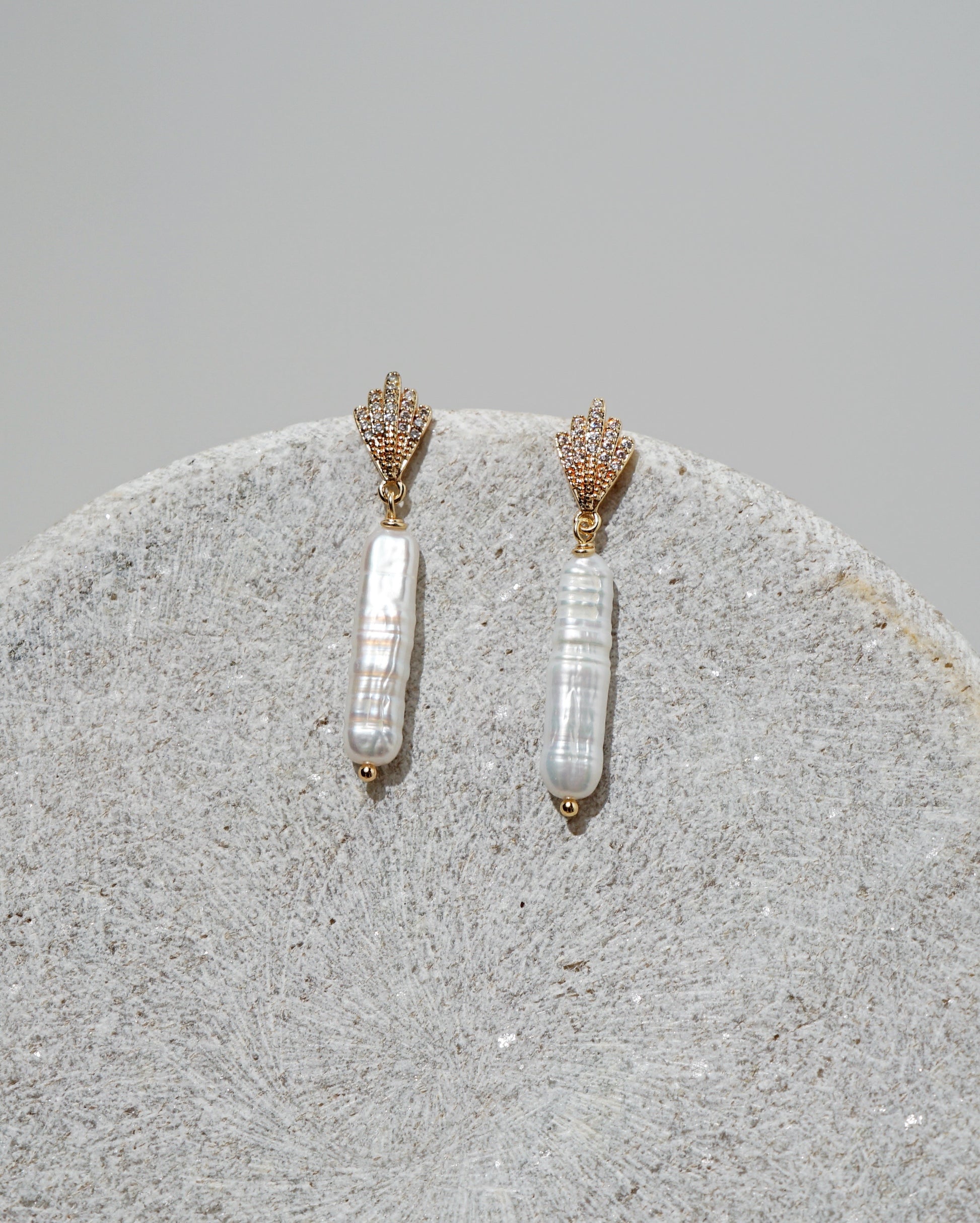 Grace meets geometry in the Noor Baroque Drop Earrings. These statement pieces feature natural freshwater stick pearls suspended from a sparkling gold-plated leaf stud. Each pearl is uniquely shaped, reflecting the beauty of nature’s imperfections and catching the light with an elegant, iridescent glow.